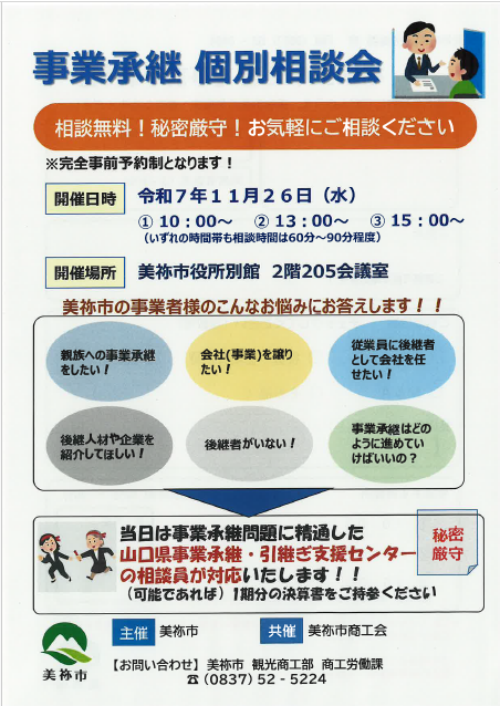詳しくは、美祢市ホームページ「事業承継個別相談会の開催」をご覧ください。