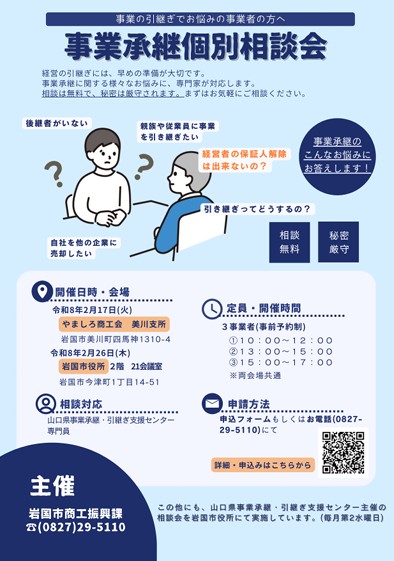 【令和8年2月17日(火)・2月26日(木)】岩国市・事業承継個別相談会のご案内